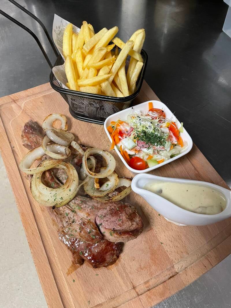 Rundstong in madeirasaus , slaatje en frietjes of puree