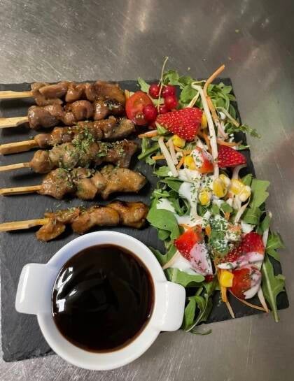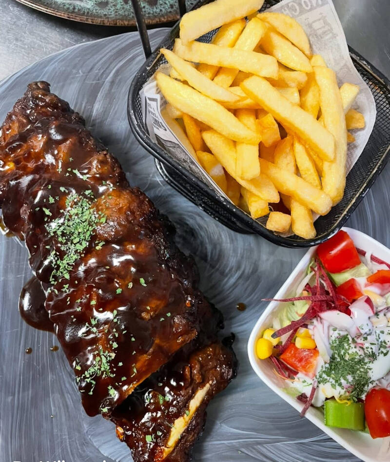 Steengrill : varkenshaasje , kip , biefstuk en chipolata , sla met slasaus, sausjes en kruiden.